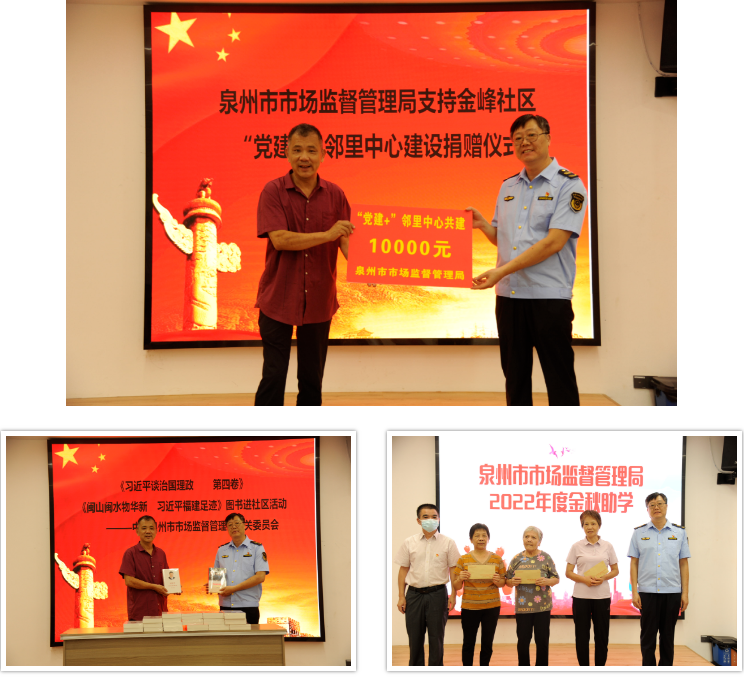 活动中,我局向金峰社区“党建+”邻里中心(新时代文明实践中心)捐赠款项支持中心基础设施建设,向中心赠送《闽山闽水物华新——习近平福建足迹》《习近平谈治国理政》第四卷等书籍,开展贫困学生家庭金秋助学活动。各志愿服务队员结合各自职能,相继在小区开展消费安全提醒、金融知识与服务咨询、眼镜验光及家用血压计准确度检定、电梯安全检测、创城创卫宣传等志愿活动。