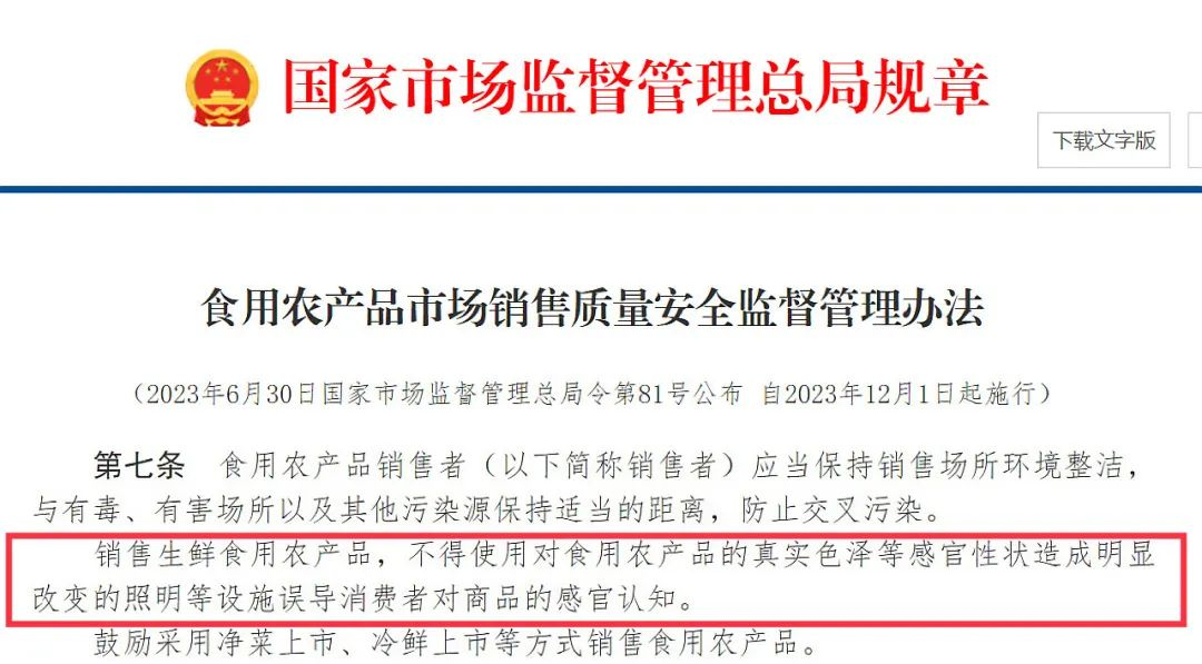 国家市场监督管理总局新修订发布的《食用农产品市场销售质量安全监督管理办法》(国家市场监督管理总局令第81号)将于今年12月1日起正式施行。《办法》规定销售生鲜食用农产品,不得使用对食用农产品的真实色泽等感官性状造成明显改变的照明等设施误导消费者对商品的感官认知。