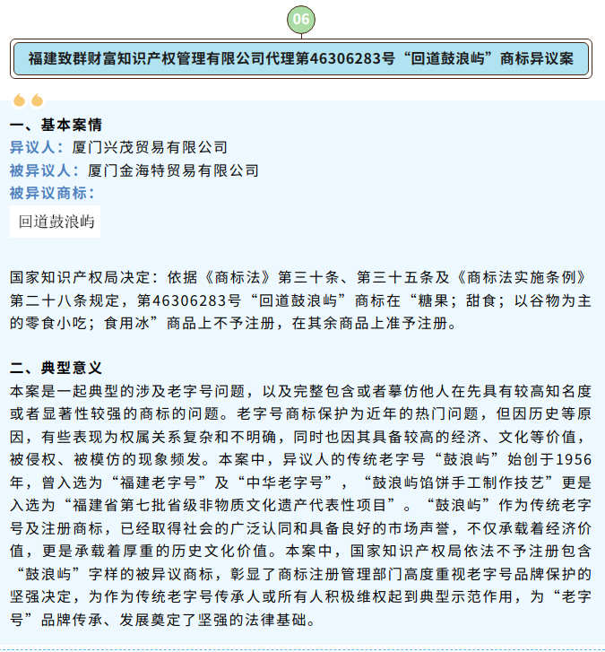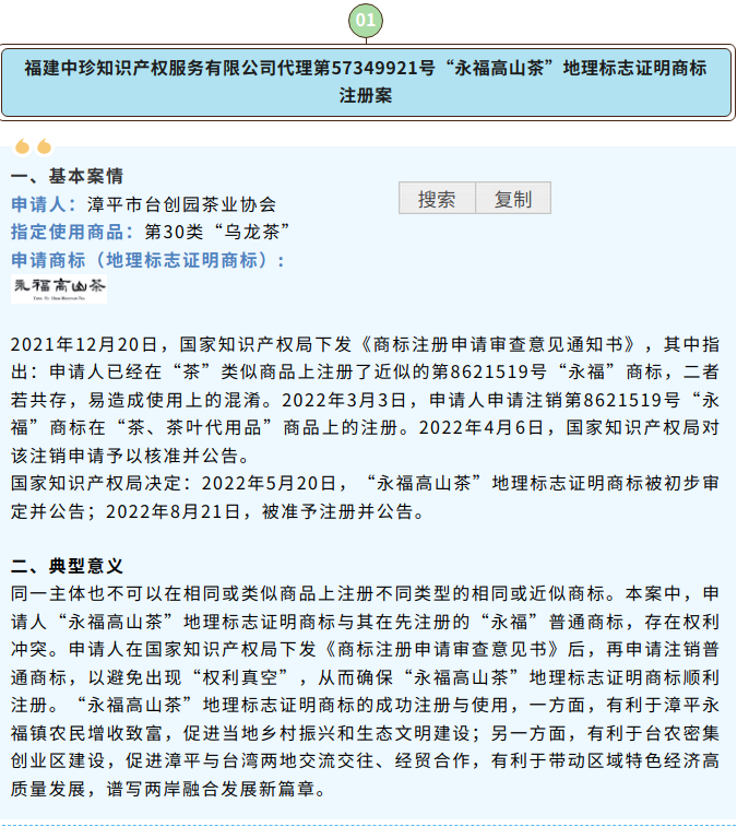 为进一步提升我省商标权利人的维权意识和商标代理服务质量,扎实开展知识产权代理行业行风建设年活动,省知识产权局、省商标协会组织开展福建省商标代理典型案例评选活动。经组织申报、专家评审等环节,确定10个案例为商标代理典型案例。该些案例涵盖商标驳回复审、商标异议、商标无效宣告等,体现了我省商标代理机构在维护商标权利人合法权益、提供优质商标代理服务方面的有益经验和做法,具有一定的示范、指导作用。 一起看看它们是谁
