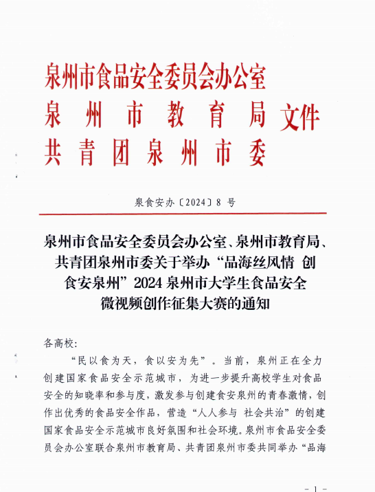 市食安办联合市教育局、团市委共同举办“品海丝风情 创食安泉州”2024泉州市大学生食品安全微视频征集大赛,大赛围绕创建国家食品安全示范城市,宣传食品安全的主题,让在泉高校学生自拟创作方向,题材方向包含但不限于食品安全知识科普宣传、发生在自己身边的食品安全故事,展示履行维护食品安全责任,积极参与食品安全知识学习,或者围绕最爱的泉州美食、用餐体验,参与文明餐桌行动,展示泉州饮食文化,展示“泉州食安创建宣言”,反对食品浪费,为泉州创建国家食品安全示范城市发出自己的声音。