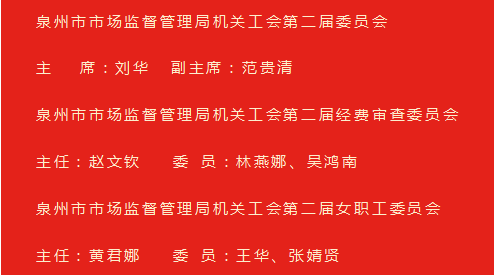 随后,泉州市市场监督管理局机关工会第二届委员会和经费审查委员会第一次全体会议分别召开,选举产生局机关工会第二届委员会主席、副主席,经费审查委员会主任,审议通过女职工委员会委员名单。