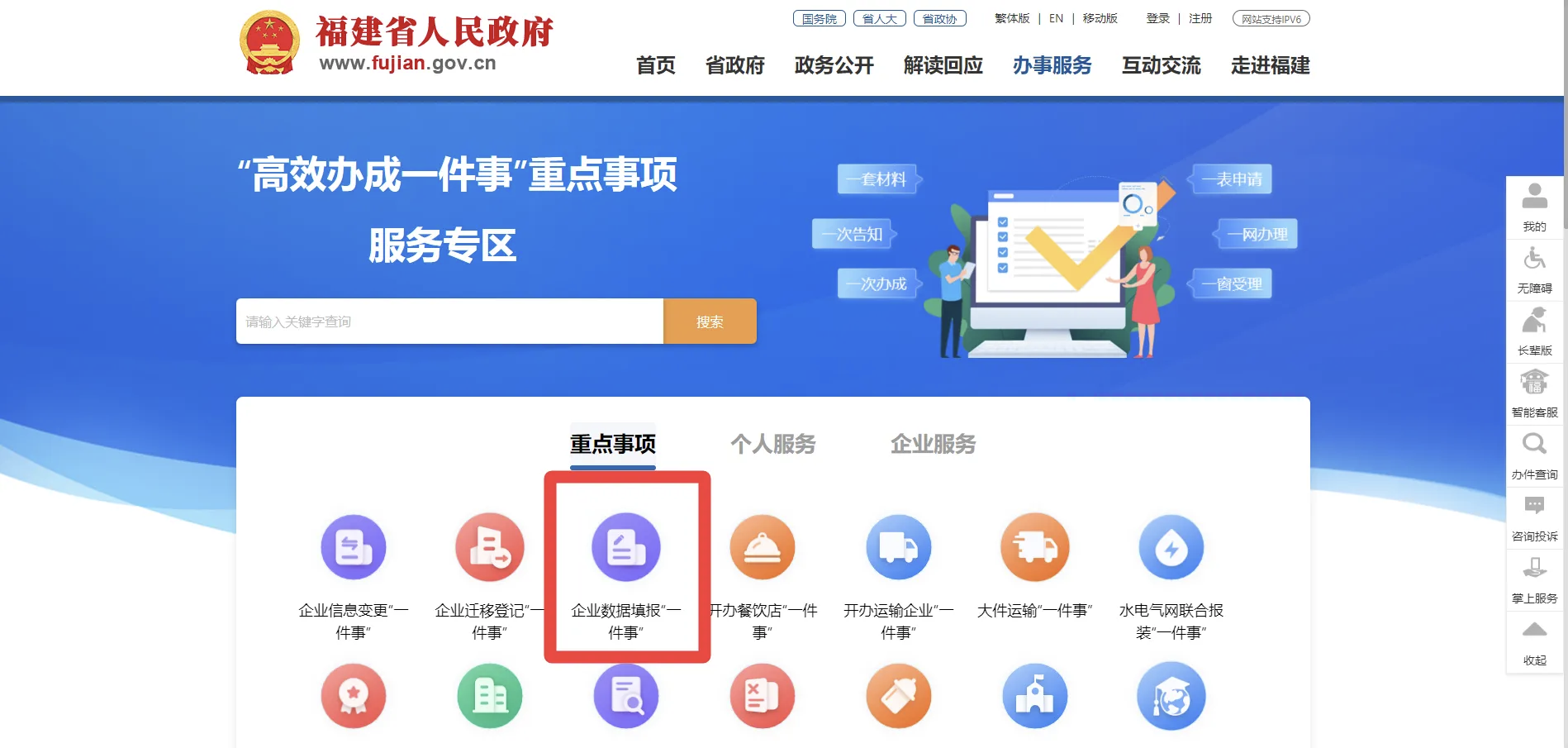 (二)经营主体根据《国务院办公厅关于印发“高效办成一件事”2024年度新一批重点事项清单的通知》(国办函〔2024〕53号)要求,为实现各类年报一站式服务,推动“一个入口、一次填报”,助力企业进一步减轻报送负担,可登录福建省网上办事大厅(https://zwfw.fujian.gov.cn)点击“高效办成一件事”菜单,进入“企业数据填报一件事”专区,填报年度报告并公示。