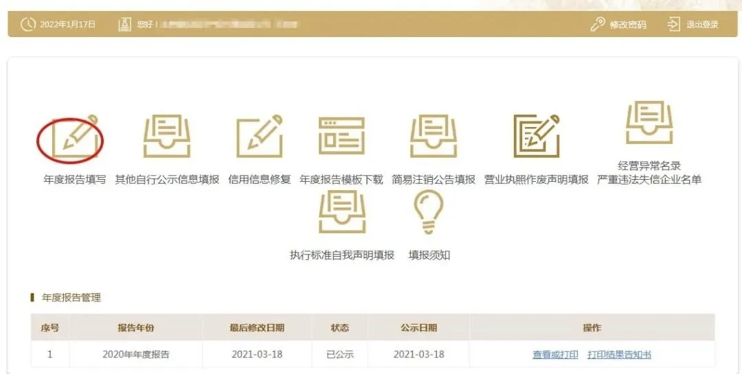 点击左上角“年度报告填写”