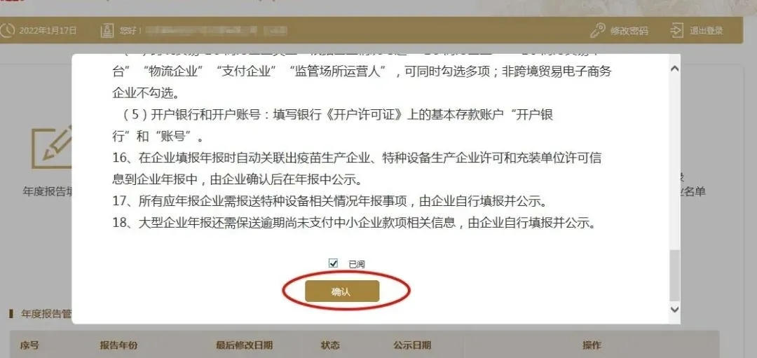 弹出年报须知,阅读后,在下方“已阅”前的小框内“∨”(对勾),再点确认。如果以前存在没有参加年报的年度,先需要将以前年度补报后才可申报本年度的。