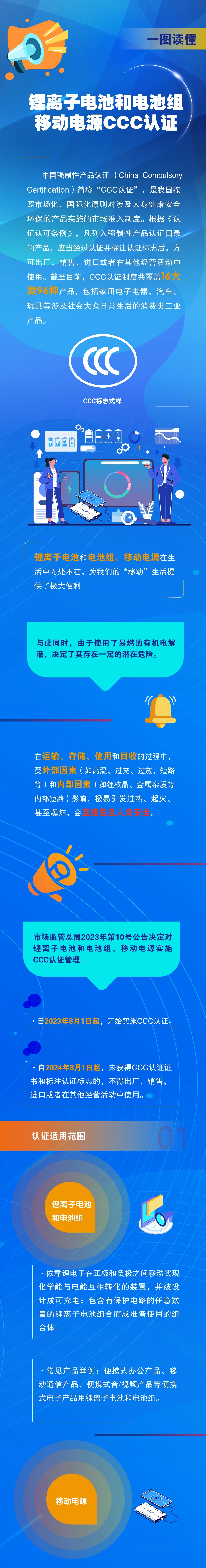 市场监管总局发布公告,自2023年8月1日起对锂离子电池和电池组、移动电源实施CCC认证管理。自2024年8月1日起,未获得CCC认证证书和标注认证标志的,不得出厂、销售、进口或者在其他经营活动中使用。