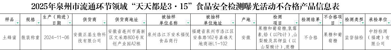 本次抽检重点检测项目依据食品品类各有侧重:蜂产品,重点检测氯霉素、呋喃西林代谢物等兽药残留,以及果糖和葡萄糖、蔗糖等品质指标;乳制品,重点检测蛋白质、脂肪等营养指标和三聚氰胺等安全指标;方便食品,重点检测酸价、过氧化值、铅以及菌落总数、大肠菌群等微生物指标。截至目前,本次专项行动共抽检蜂产品、乳制品、方便食品251批次,250批次均合格,发现1批不合格土蜂蜜,不合格项目为果糖和葡萄糖。以下为不合格产品信息: