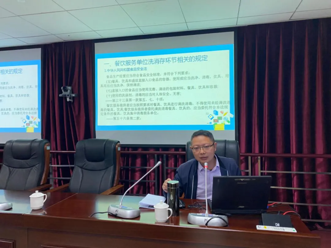 会议还邀请了泉州市市场监管综合执法支队的赖礼碧同志以“餐饮服务单位洗消存环节的合规管理”为题进行授课,指导各级各类学校和校外供餐单位针对餐饮具洗消环节的食品安全风险点,建立健全食品安全管理制度,严格落实《GB31654 食品安全国家标准 餐饮服务通用卫生规范》和《食品安全国家标准 消毒餐(饮)具》等规范要求。