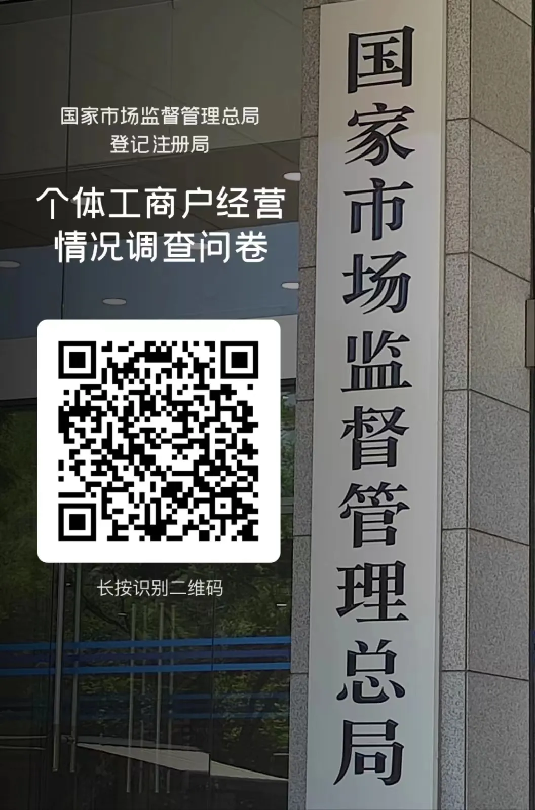 您好!为更好地了解个体工商户生存发展状况,摸清个体工商户发展中的难点痛点堵点问题,倾听大家对包括市场监管部门在内的各部门、各方面建议,推动在支持个体工商户稳信心、渡难关、谋发展上定实策、出实招,作为全国个体工商户的“娘家人”,我们专门设计了这份调查问卷。热切地期盼您能抽出宝贵时间填写问卷,留下您宝贵的意见建议。