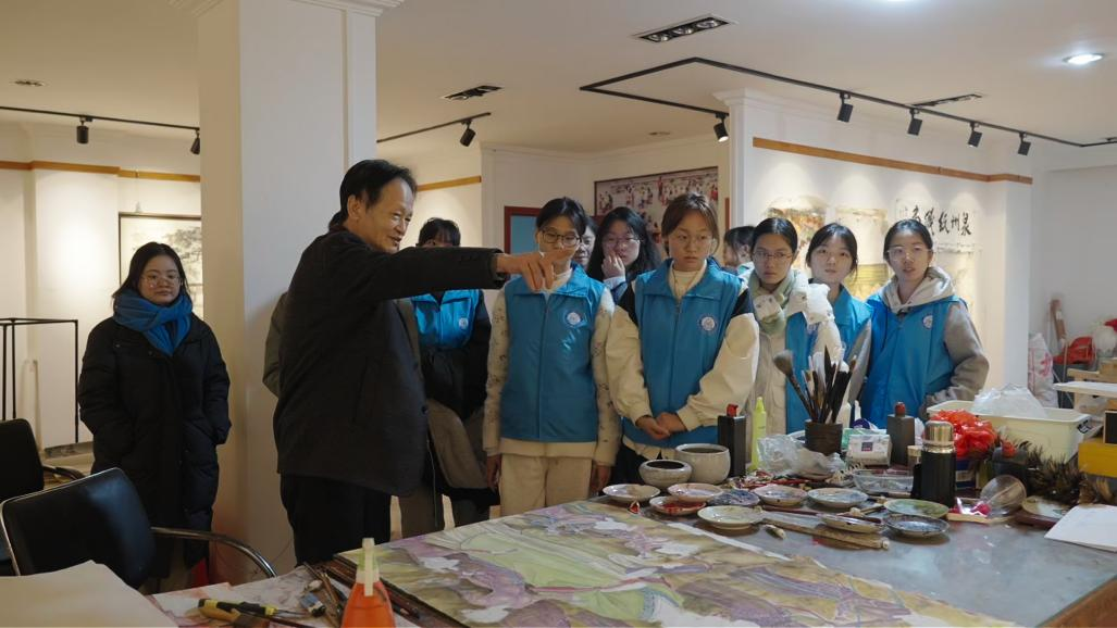 (实践队聆听李老师讲解漆篮作品)