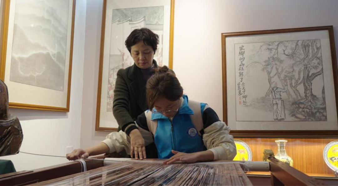 (方老师指导实践队队员学习纸织画编织)