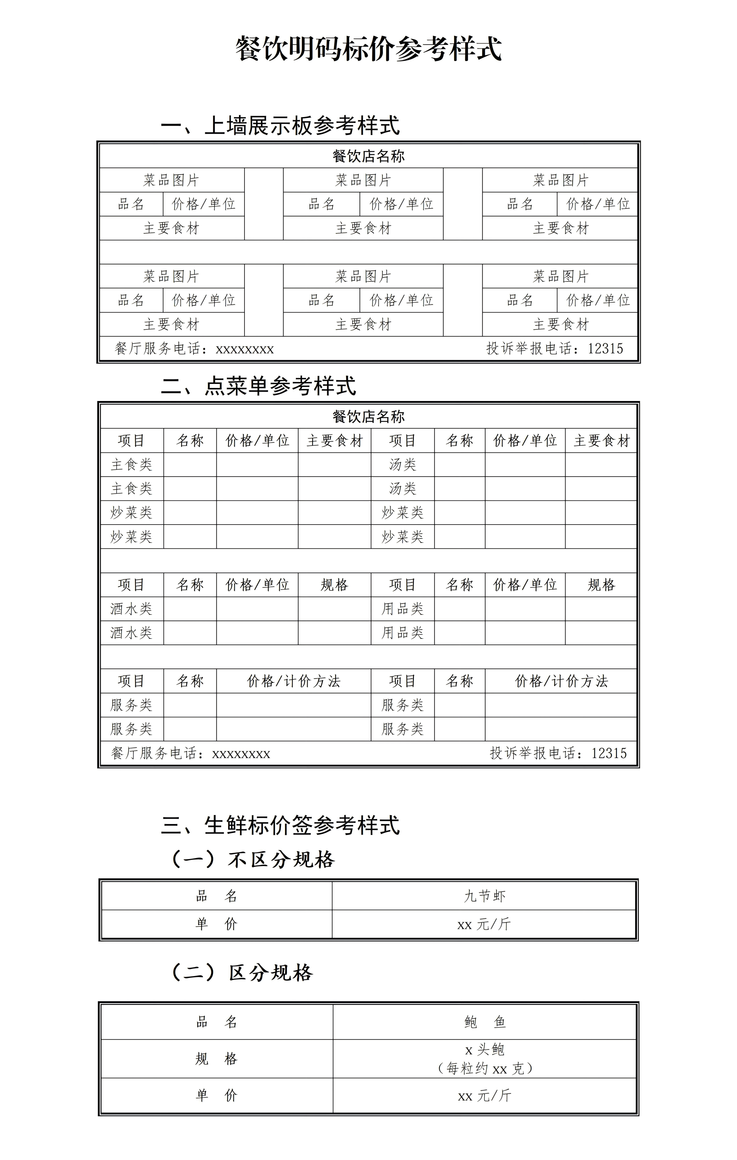 一、不得使用品名、价格、计价单位标示不清的价目表、点菜单,或使用“时价”“面议”等模糊表述规避明码标价义务。