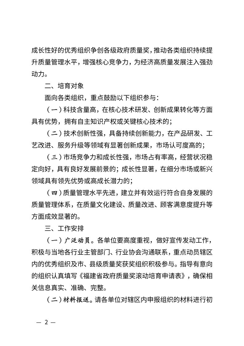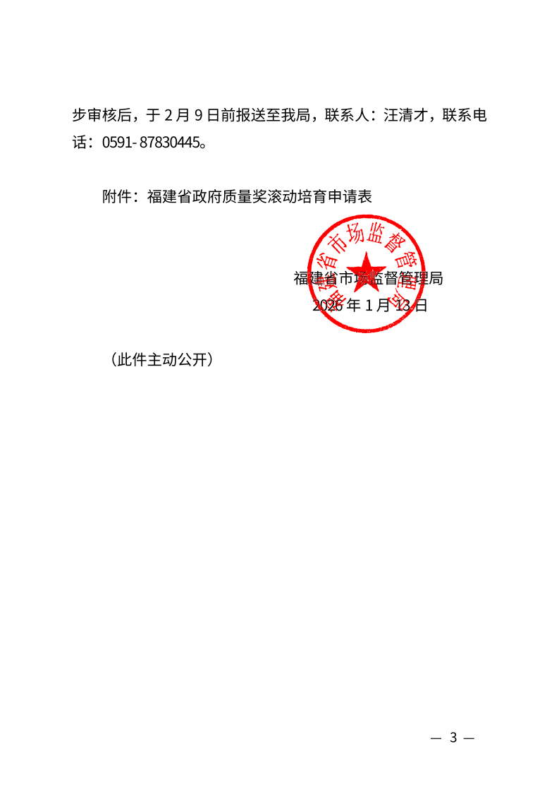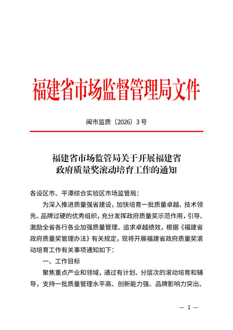 现将《福建省市场监管局关于开展福建省政府质量奖滚动培育工作的通知》(闽市监质〔2026〕3号)转发给你们,请结合以下要求一并抓好贯彻落实: