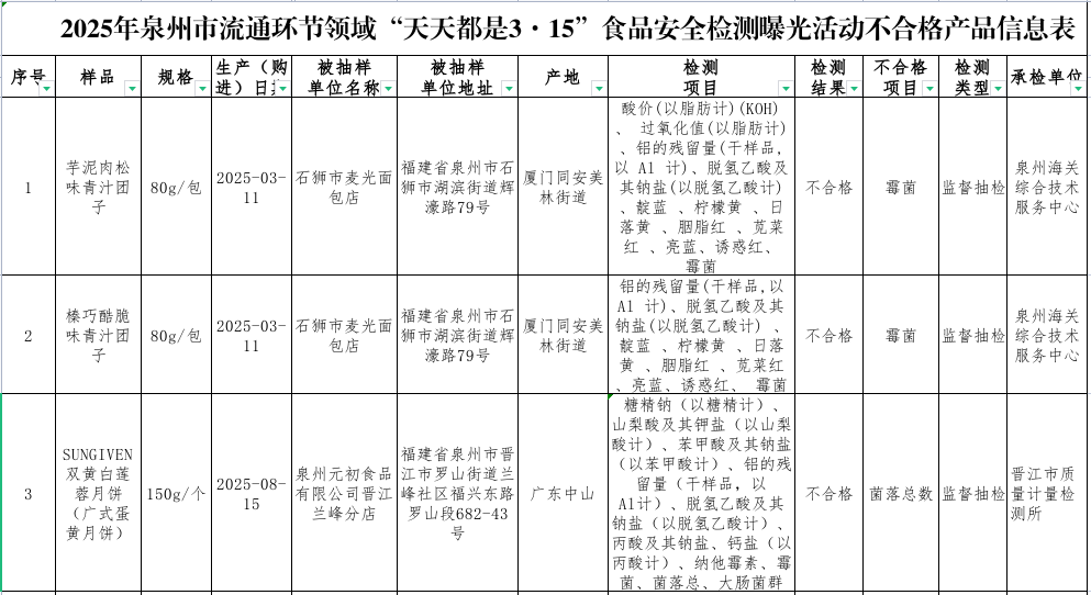 截至目前,本次专项行动共抽检414批次,其中月饼228批次,面包170批次,饼干16批次。其中,发现3批次不合格食品,不合格项目为霉菌、菌落总数,411批次为合格食品,合格率为99.2%。结果表明,我市流通领域销售的月饼、糕点面包产品总体安全状况良好,抽检合格率高。以下为不合格产品信息: