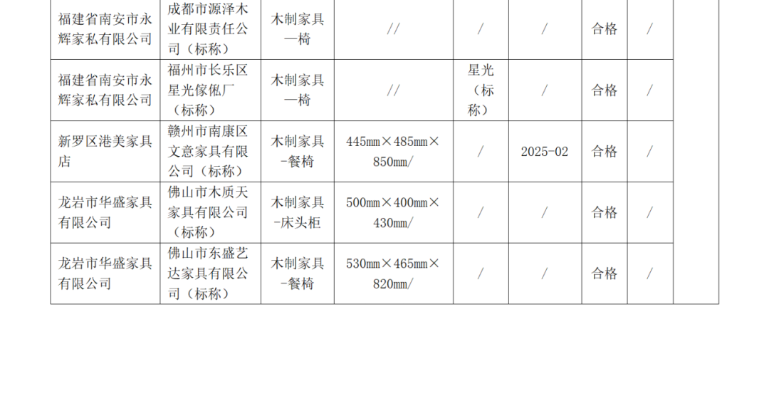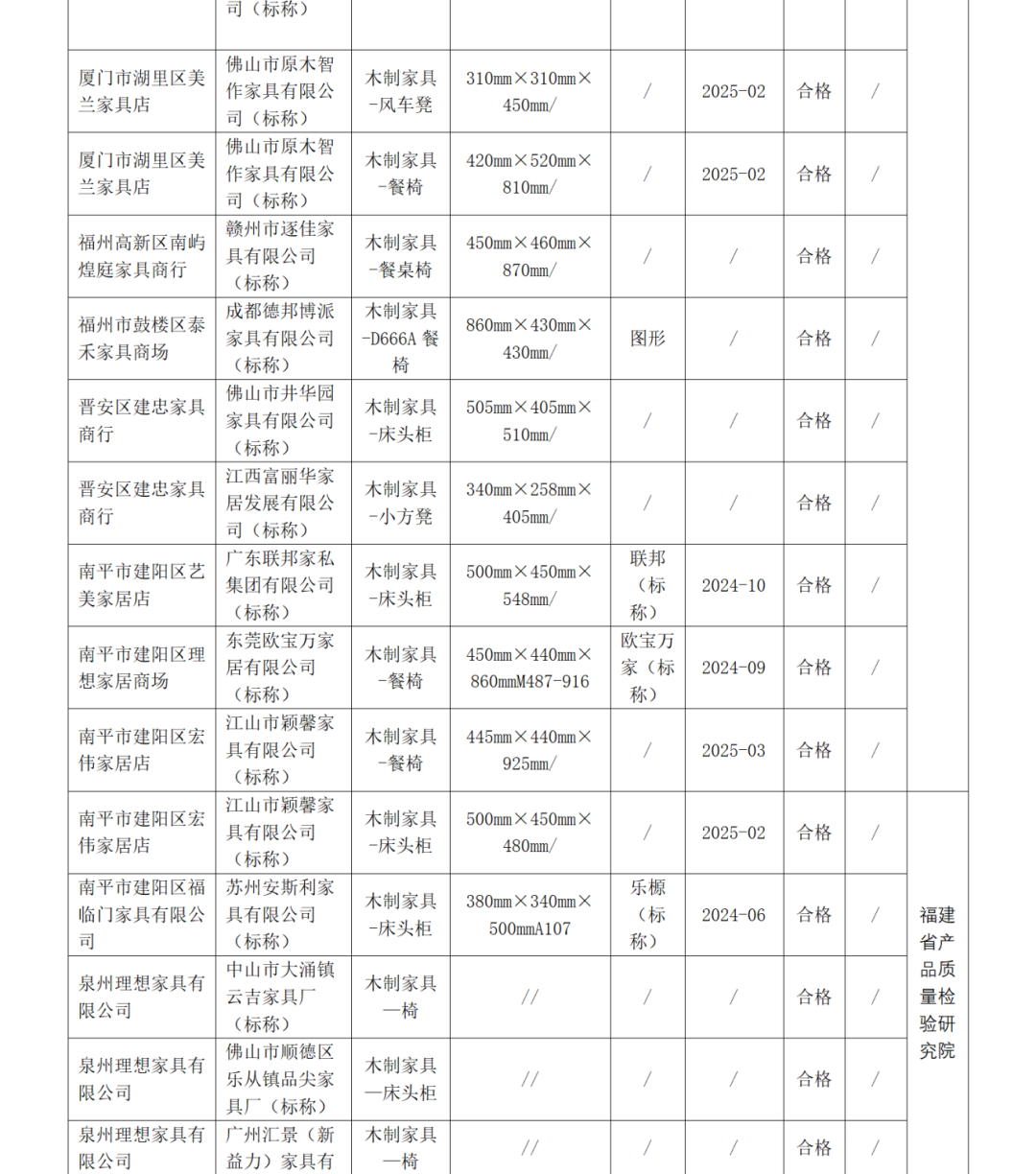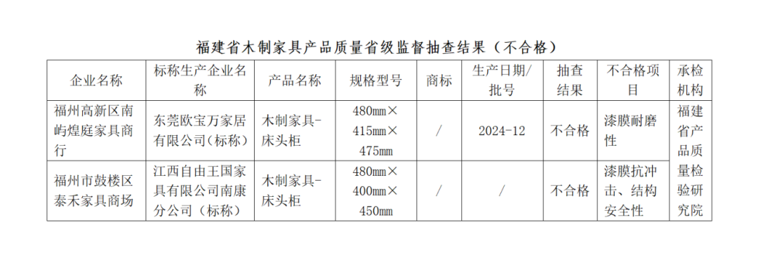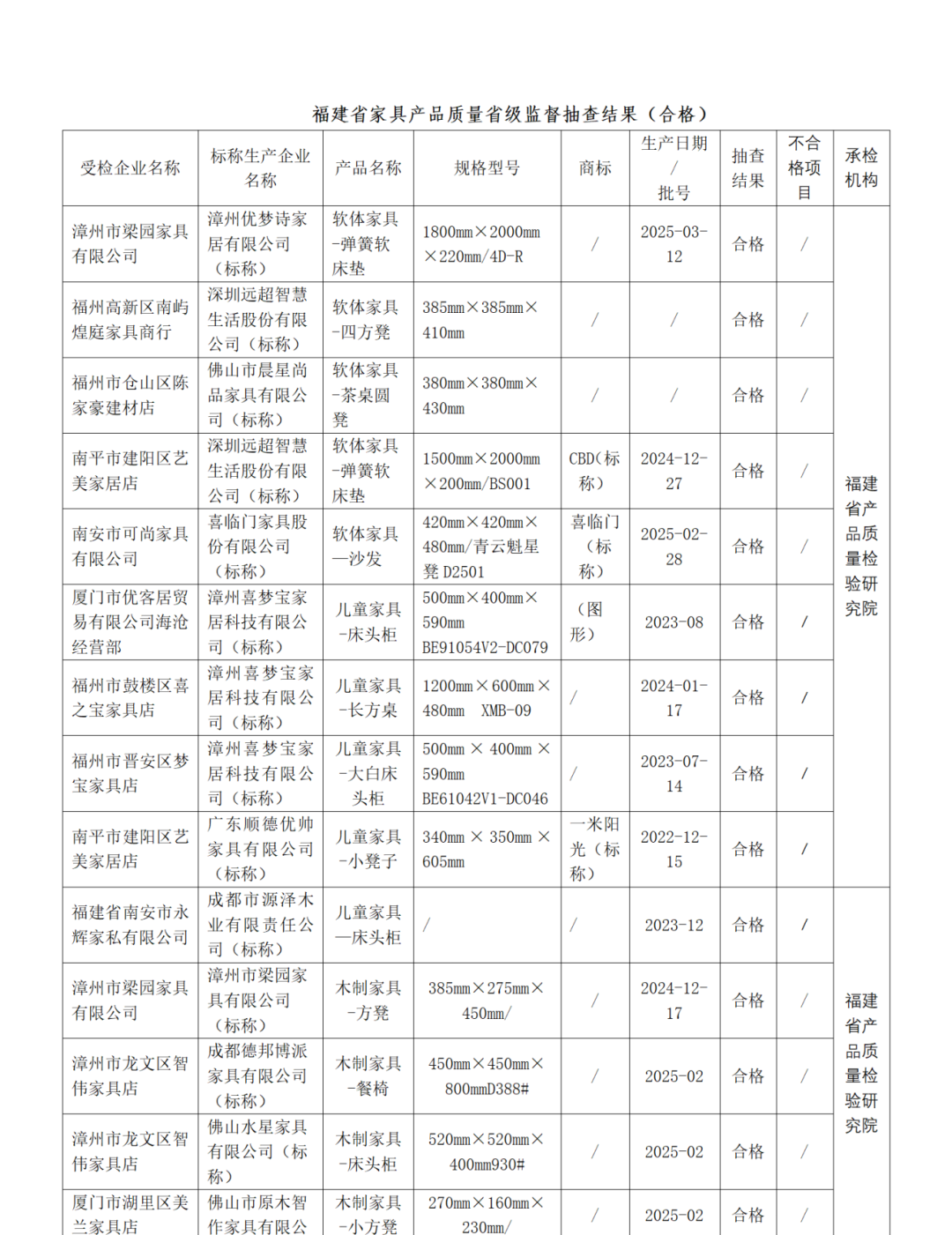 近期,依据《中华人民共和国产品质量法》和相关产品标准及抽查细则明确项目,福建省市场监督管理局组织对销售企业软体家具、儿童家具和木制家具产品质量开展省级监督抽查。本次共抽查19家销售企业35批次家具产品,其中2批次木制家具不合格,合格率为94.3%。
